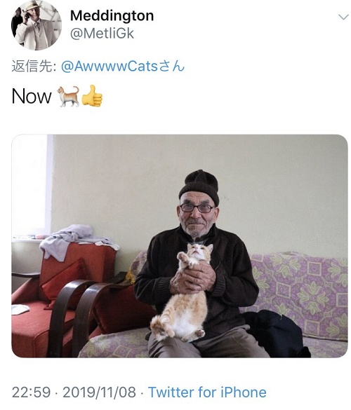 おじいさんの猫さんに対する愛情が温かくて涙がでますね😢— どこかの兄やん🌸 (@oAu1bDpWdrlmVtg) November 12, 2019